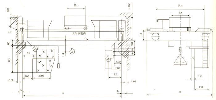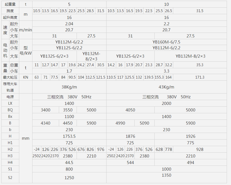 本產(chǎn)品廣泛適用于普通重物的裝卸與搬運(yùn),還可配以多種專用吊具進(jìn)行特殊作業(yè),當(dāng)露天使用時(shí)帶有防雨設(shè)備。表中數(shù)據(jù)為室內(nèi)起重機(jī)用,室外起重機(jī)總重和輪壓約增加5%,起重機(jī)按使用繁忙程度分為中級(jí)(A5)和重級(jí)(A6)兩種工作制度。選用時(shí)應(yīng)注明工作制度,工作環(huán)境的最高、最低氣溫及電源種類等技術(shù)要求,還可根據(jù)用戶要求的跨度設(shè)計(jì)制造。